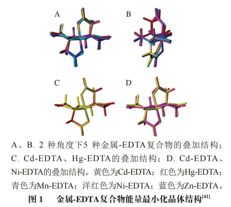 除了构建抗体分子模型外,利用分子模拟构建金属-螯合剂复合物整体的分子模型能从半抗原的空间构型角度分析影响抗体识别的半抗原空间结构特征。Jones等基于现有的晶体结构,建立了5 种不同的二价金属-螯合剂复合物的分子模型(图1A、B)。为了确定可能影响抗体识别的半抗原结构特征,将这些模型进行比较,并结合距离矩阵鉴别出几种半抗原三维结构存在差异的区域。研究发现,Cd-EDTA和Hg-EDTA结构中原子位置的距离差都在0.2 Å以下,这两种配合物的三维结构非常相似(图1C),这可能是导致抗体对两种不同半抗原有相似亲和力的原因。而Cd-EDTA和镍(Ni)-EDTA的结构差距最大(图1D)。由此推断,抗体亲和力与这些金属-EDTA复合物总体结构的差异程度密切相关。