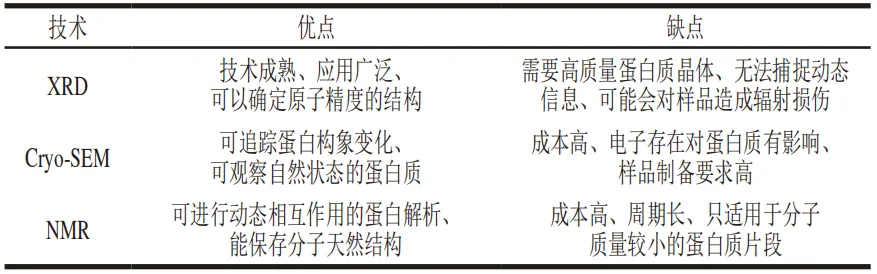 目前,蛋白质晶体结构解析的手段主要有X射线衍射(XRD)技术、核磁共振(NMR)技术、低温冷冻扫描电镜(Cryo-SEM)技术3 种。表2总结了3 种技术的优缺点。其中,NMR技术及Cryo-SEM技术具有成本过高、制样无法满足分析要求等局限性,在抗体结构解析中应用较少。XRD技术是目前应用最广泛、技术最成熟的方法。截至2024年,蛋白质结构数据库(https://www.rcsb.org/)中有85%以上的蛋白质晶体结构是通过XRD技术获得的。
