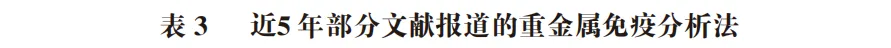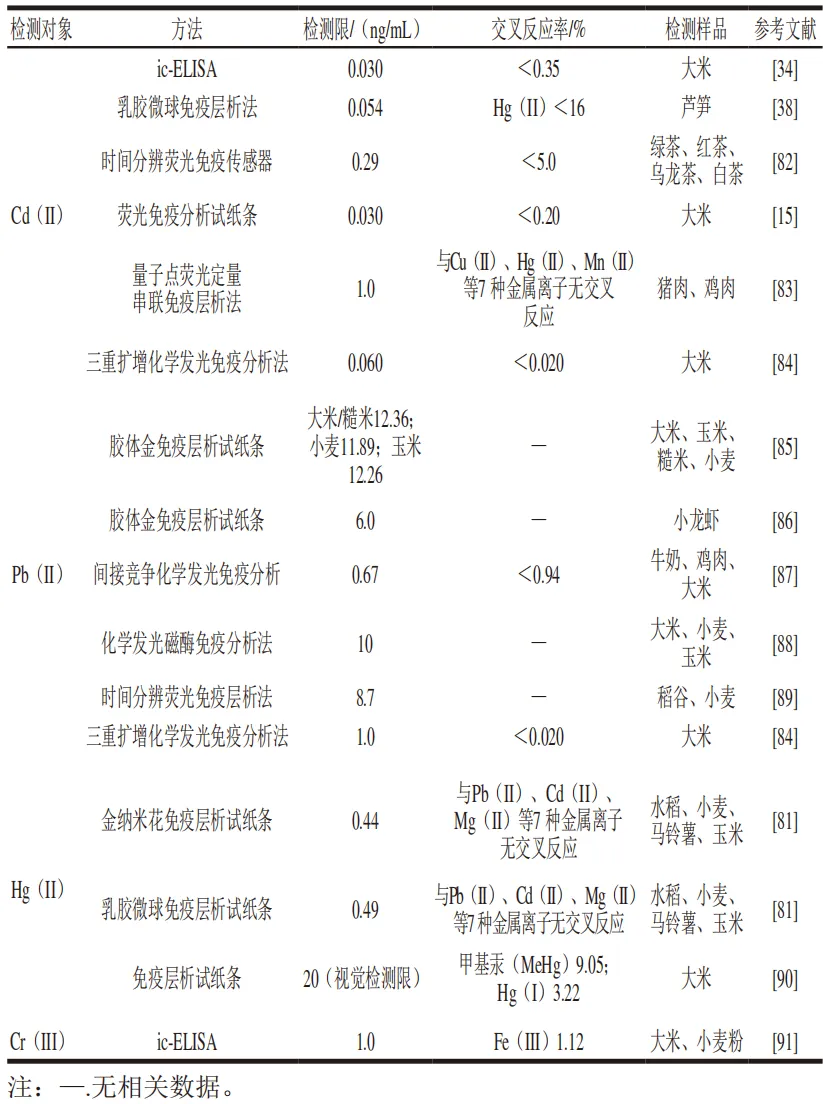 重金属由于其毒性大、容易在食品中残留蓄积的特点已经引起人们的广泛关注。我国于2023年实施的GB 2762—2022《食品中污染物限量》规定了各种重金属在食品中的残留限量标准,其中以Cd在饮用天然矿泉水中的限量指标最低(0.003 mg/L)。因此,开发高灵敏度、高特异性的重金属免疫分析法用于食品中重金属残留的快速检测具有良好的前景和应用价值。表3总结了近5 年来部分文献报道的重金属免疫分析法及其效果。其中,Ling Sumei等制备了Hg单克隆抗体,采用ic-ELISA法测定其性能,发现该抗体的灵敏度高,检测限远低于先前报道的Hg抗体。基于该抗体,Ling Sumei等开发了两种免疫层析试纸条,以检测多种食品中的Hg残留。结果表明,两种试纸条兼具高灵敏度和高特异性,能满足现场快速、高效、便携式检测的需求。Xu Naifeng等建立了乳胶微球免疫层析法以检测芦笋中的Cd残留。该方法灵敏度虽高,但与Hg有16%的交叉反应率,特异性欠佳。因此,综合重金属免疫分析法的研究现状,高质量抗体的开发是未来重金属免疫分析技术的研究重点。结合重金属抗体对抗原的特异性识别与互作机制研究能够为重金属的免疫分析法提供性能更优异的抗体核心试剂。