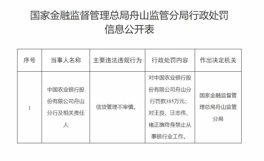 2月13日,农行舟山分行因信贷管理不审慎,被罚款385万元,更狠的是,三名责任人直接被终身禁止从事银行业。