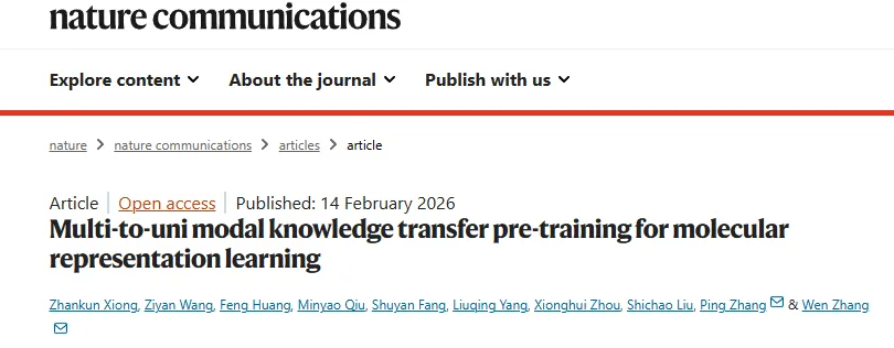 近日,华中农业大学章文教授团队联合美国俄亥俄州立大学张平教授在《Nature Communications》发表了题为“Multi-to-uni modal knowledge transfer pre-training for molecular representation learning”的研究论文。该论文于2026年正式接收发表,第一作者为熊展坤、王紫嫣、黄峰三位共同贡献者。研究团队提出了一种名为M2UMol的多模态知识迁移预训练框架,通过巧妙的“多对一”模态迁移策略,使模型能够在预训练阶段接受不完整的模态输入,并在仅提供二维分子图的下游任务中生成高质量的多模态分子表征。