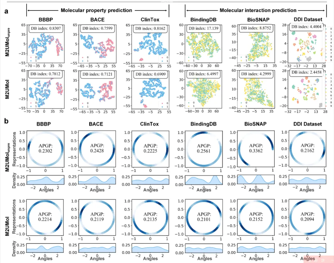 在下游任务表征质量分析中,研究对比了经过预训练的M2UMol与未经预训练的版本在测试集上的表征分布。结果显示,M2UMol学习到的正负样本表征在BBBP和BACE数据集上分离更加清晰;在DTI任务中DB指数显著降低;在DDI任务中同类样本聚类更加紧密。通过高斯核密度估计和平均成对高斯势(APGP)分数评估,M2UMol生成的分子表征在单位超球面上分布更为均匀,APGP分数更低,角度密度估计曲线更加平滑,表明模型能够学习到包含更丰富信息的分子表征,避免表征坍缩问题。