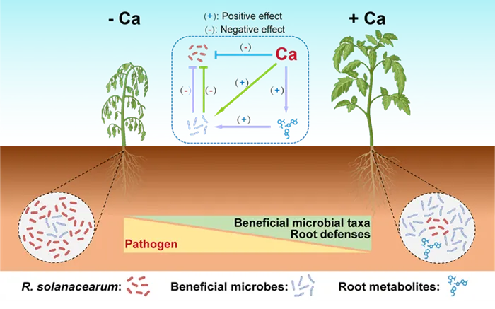 近日,中国农业科学院农业资源与农业区划研究所土壤植物互作创新团队研究发现,通过土壤养分精准调控可增强植物免疫活性,靶向富集根系有益菌群,抑制作物病害发生。相关研究成果发表在《微生物组(Microbiome)》上。土传病害严重影响作物的产量和品质。植物根系微生物组维持宿主健康,增强宿主抗病能力的潜力巨大,但靶向操纵根系微生物组以实现病害防控是其推广应用的难点。该研究通过比较元素种类和施用水平,结合多组学方法,发现提高酸性土壤钙浓度,可显著激活番茄系统抗性,提高根系水杨酸、海藻糖等免疫相关代谢物含量,进而富集拮抗青枯病菌的有益菌(戴氏菌、罗河杆菌、多粘类芽孢杆菌和铜绿假单胞菌等),实现番茄青枯病防控的目的。该研究揭示了“土壤营养调控-植物免疫激活-根系分泌物改变-有益菌定向富集”多级联动增效的作用机制,为通过土壤营养调控改良根系微生物组、实现土传病害绿色防控提供了简单有效的解决方案。该研究得到国家重点研发计划、中国农业科学院科技创新工程等项目支持。
