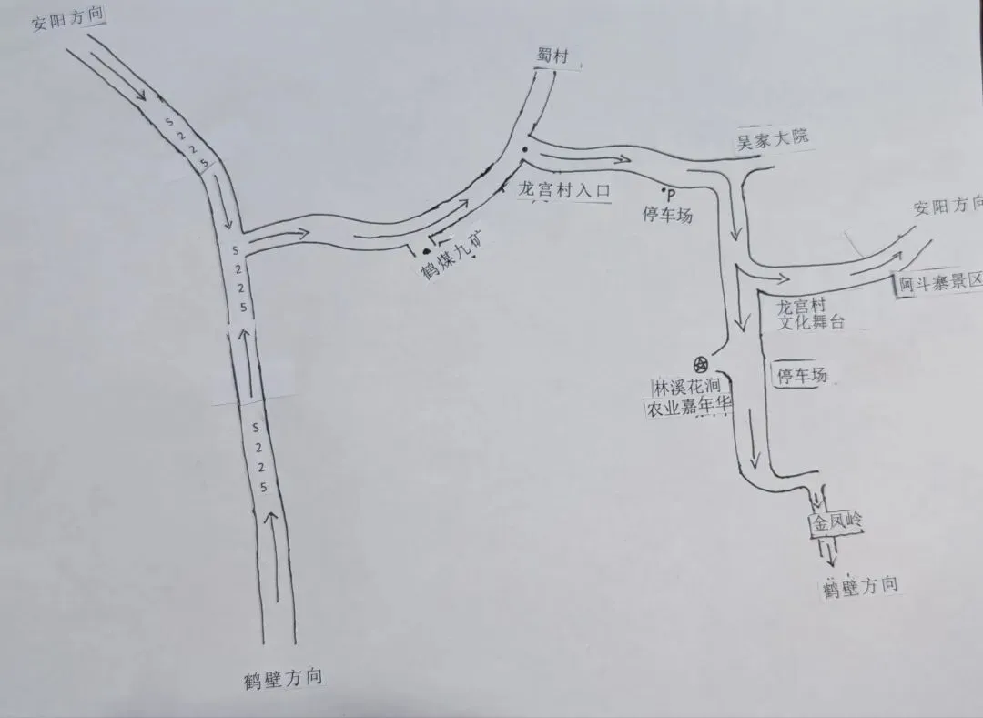 一、进入路线S225(鹤壁方向或安阳方向)--蜀大线--龙宫村入口--停车场--龙宫村文化舞台--停车场--林溪花涧农业嘉年华
