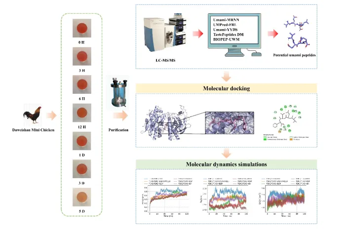 近年来,基于动物蛋白的鲜味肽开发进展显著,鸡肉因其富含优质蛋白,肉质鲜美,易酶解特性,被视为可持续鲜味肽生产的理想来源。目前,关于鸡肉中鲜味肽的研究主要集中于成品鸡肉的分析,忽略了鸡肉风味的形成是一个动态过程。而鸡肉的最终风味品质,尤其是备受消费者青睐的“鲜味”,并非在屠宰时即刻形成,而是在一系列复杂的宰后生理生化变化过程中逐步构建的,涉及蛋白质降解、微生物生态变化、水分迁移以及氧化反应等多个方面,这些变化直接影响肉的食用品质、风味、加工性能和货架期。