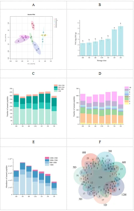 采用肽组学技术系统解析了宰后0 h至5 d不同熟化阶段肌肉中鲜味肽的形成规律,构建了时间梯度鲜味肽谱系并鉴定出128条潜在鲜味肽,其分子量主要集中在<800 Da,肽段长度以4-5个氨基酸为主。宰后早期(3 h)鲜味肽丰度最高,随成熟时间延长逐渐下降,与内源酶活性变化及蛋白质降解进程相关。