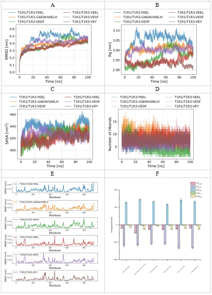 利用BIOPEP-UWM数据库筛选出16条鲜味活性片段较高的肽段。分子对接结果显示,6条鲜味肽(VEDF、VEY、FEEL、GAEAVVAELH、VEEL和VESF)与T1R1/T1R3受体具有较强的结合能力,结合能范围为-6.2到-7.7 kcal/mol。分子动力学模拟进一步验证了这些鲜味肽与受体结合的稳定性,其中GAEAVVAELH、VEEL、VESF、VEY表现出最高的结合稳定性,而VEDF和FEEL的结合稳定性较低。