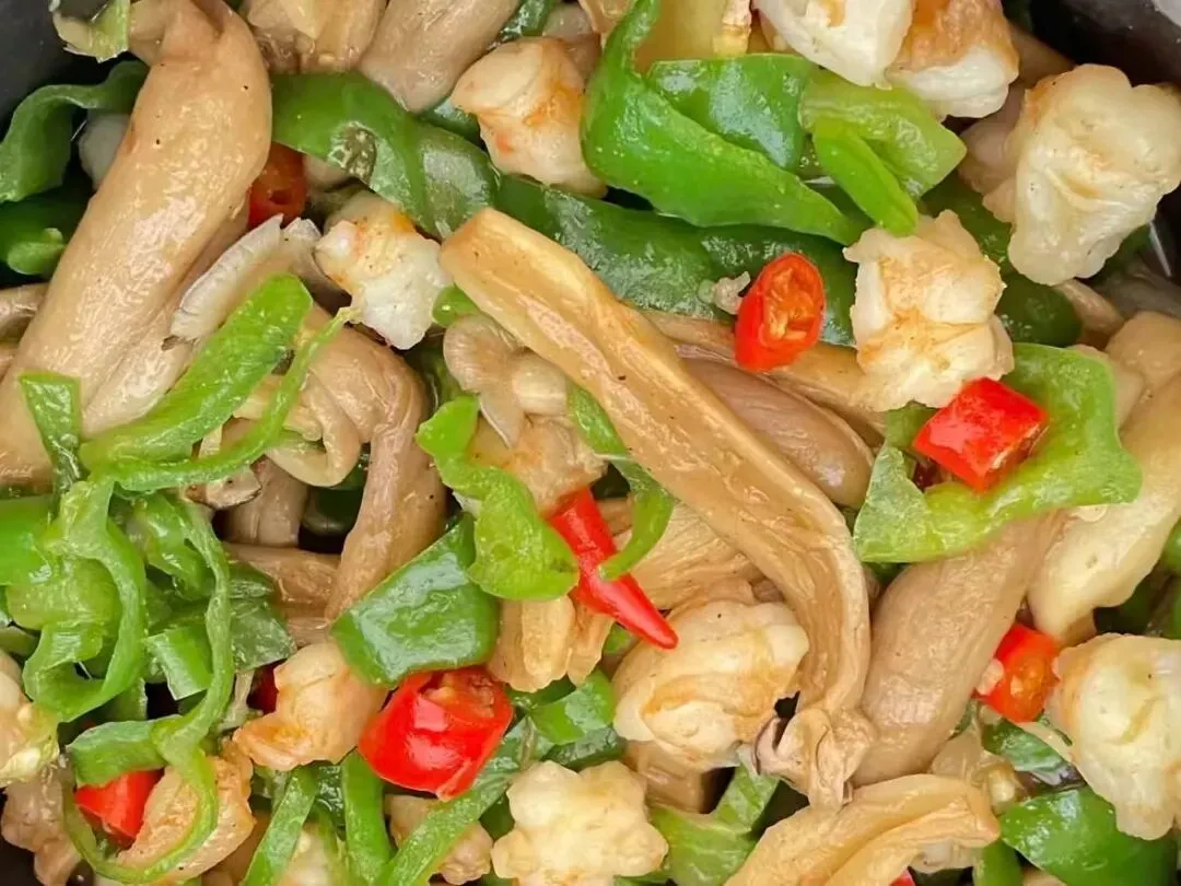 虾仁100克、鹿茸菇200克、青椒2个、小米辣、姜片、盐。
