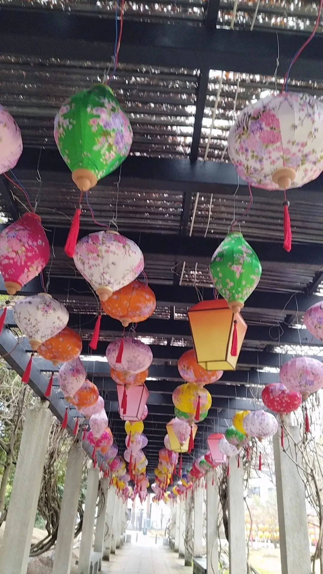 今天是大年初一,马年第一天,我约了朋友去观光园转一圈。天气还是很冷。骑了十几分钟电动车冻的手冻僵了。我们用抖音券付了10元门票。进了大门第一个景点就是头顶一溜溜五彩斑斓转动的小风车,一直延伸至神农广场。