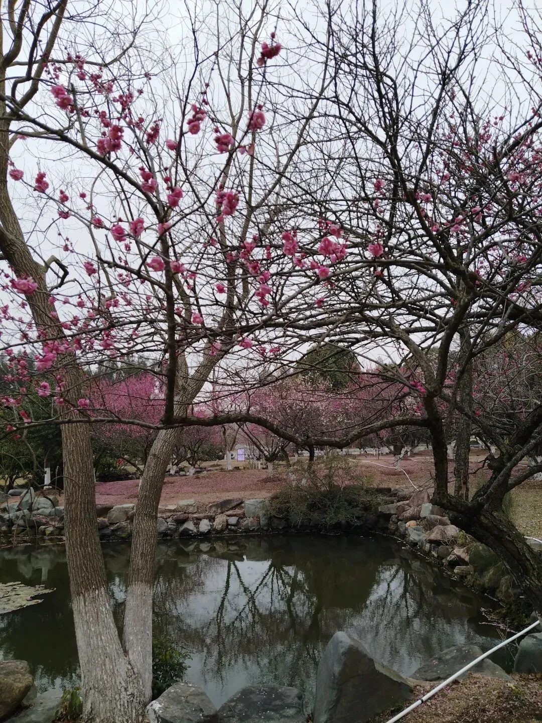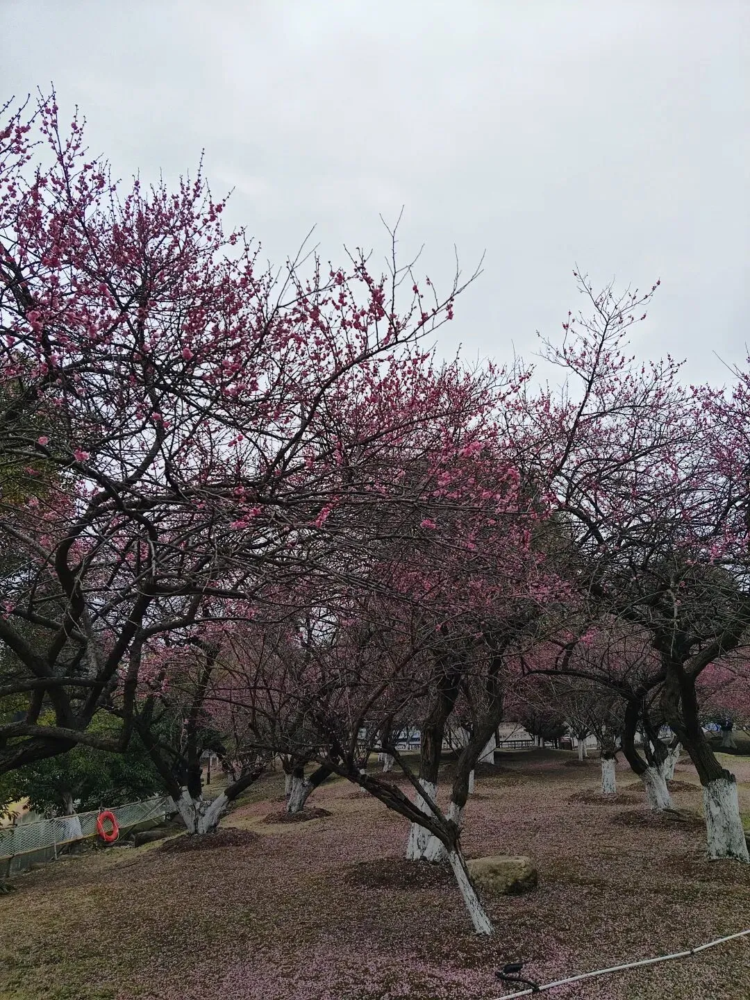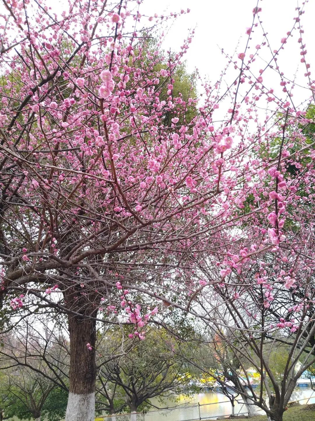 我们来到了湖边,这里有一片红梅开的十分鲜艳。地上铺了一层薄薄的粉色花瓣给这个虽暖乍寒的新春增添一份温柔色彩