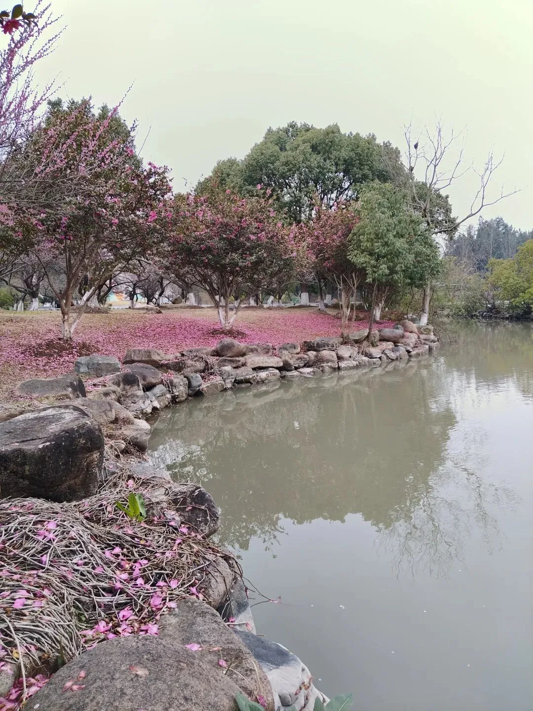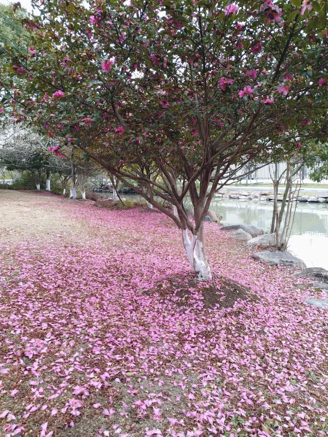 山茶花开败了,撒了一地粉色的浪漫,湖水涟涟,相映成趣愿我们眼里有光,心里有爱, 这一年,愿我们有跨越山海的勇气,也有马放南山的从容。烟火起,照人间,举杯敬此年。
