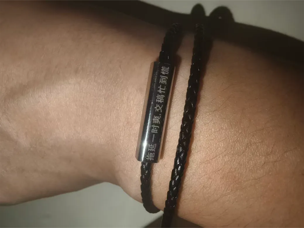 “作为一名职场老兵,在职读研本就是一场自我挑战,论文创作更是耗时耗力的硬骨头。手环上‘拖延一时爽,交稿忙到慌’这句话,既接地气又特别走心。平时开会、加班间隙,摸一摸手腕上的手环,就像收到了无声的鞭策,立马又有了挤出时间改论文、做研究的动力。” 振兴言语间满是务实与坚定,质朴的表达道出了众多在职学子的心声。