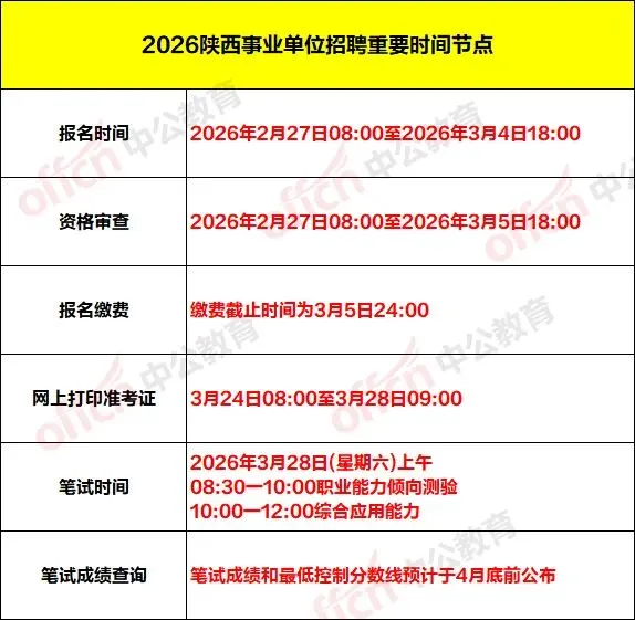 2026陕西事业单位招聘6619人公告已发布,报名时间:2026年2月27日08:00至2026年3月4日18:00。笔试时间:2026年3月28日(星期六)上午。笔试内容。笔试包括《职业能力倾向测验》和《综合应用能力》两科,各科满分均为150分。陕西事业单位招聘岗位有综合管理类(A类)(含三支一扶岗位),中小学教师类(D类),医疗卫生类(E类)。