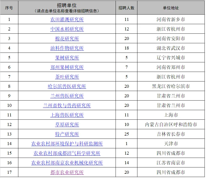 岗位包括科研、管理岗位等类型,涉及31家单位共招聘359人,其中,京内单位招聘128人,详见《中国农业科学院2026年度第一批统一公开招聘岗位信息表(京内单位)》(附件1);京外单位招聘231人,详见《中国农业科学院2026年度第一批统一公开招聘岗位信息表(京外单位)》(附件2)。