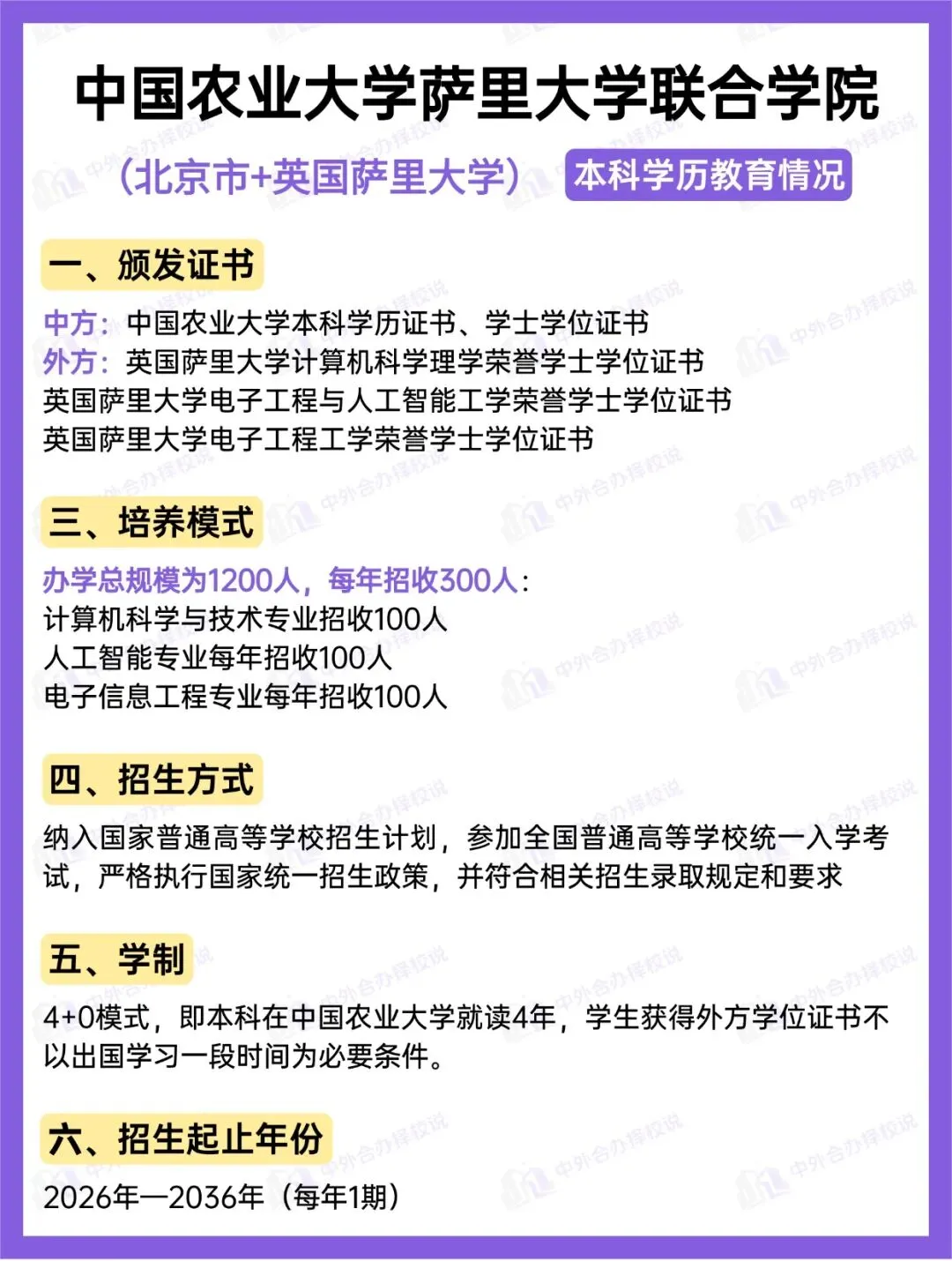 1、这是中国农业大学2026年全新启动的“转型级”中外合作项目,彻底打破了农大中外合作聚焦农林专业的传统印象,直接瞄准计算机、人工智能、电子信息工程这三个长期热门的工科赛道,三个专业是数字经济时代的核心刚需领域,就业面广、行业缺口大,不管是技术岗还是交叉领域就业,都有极强的市场竞争力。对想读硬核工科但又希望借助985平台提升起点的学生来说,这个新项目提供了一个全新选择,不用再局限于农大的传统优势学科,能以985背景切入热门工科领域,未来发展弹性极大。而且项目有教育部批准的10年招生周期,每年统招300人,规模适中且办学稳定性有政策保障,不用担心是短期试点项目。