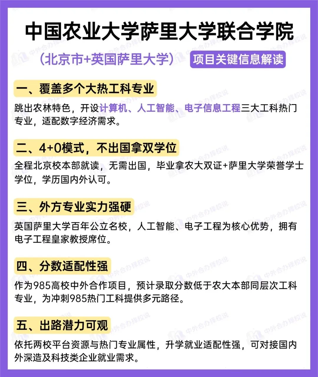 3、虽然项目暂无过往录取分数参考,但结合985高校中外合作项目的普遍规律,其录取分数大概率会低于农大本部的计算机、电子信息等热门工科专业。这对分数卡在“想冲985但不够本部热门专业线”的学生来说,是极具吸引力的“曲线救国”机会。更难得的是,它不像很多985中外合办项目那样“专业冷门”或“需强制出国”,而是兼顾了“热门专业+不出国+双学位”三大核心需求,适配性远超同类项目。