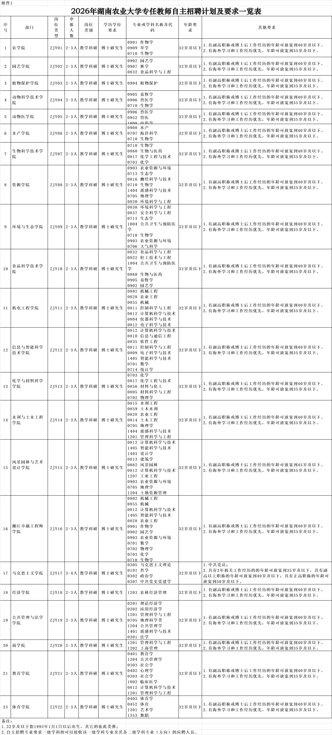 2.专任教师。详见《湖南农业大学2026年专任教师自主招聘计划及要求一览表》。