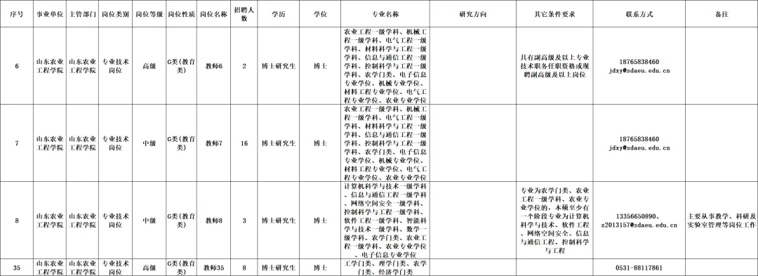 山东农业工程学院是山东省省属普通本科院校。1953年,山东省人民政府批准设立山东省农林干部学校,期间分设为山东省农业干部学校、山东省林业干部学校,1959年合并为山东省农林干部学校,后又历经山东省革命委员会五七干部学校、山东省革委会生产指挥部五七干校、山东省省级机关五七干部学校,1979年恢复山东省农林干部学校,1983年改建为山东省农业管理干部学院,2013年改建为山东农业工程学院。多年的办学积淀,铸就了学校艰苦奋斗的优良传统和奋发向上的进取精神,形成了“厚德、自强、求是、笃行”的校训,“勤勉、实干、精业、励新”的校风和“以学生为中心、以育人为根本、以服务求发展、以特色强内涵”的办学理念。学校坚持党的全面领导,贯彻党的教育方针,紧紧围绕立德树人根本任务,不断更新教育观念、深化综合改革,致力于培养专业基础扎实,实践能力较强,适应能力良好,具有家国情怀和创新精神,德智体美劳全面发展的知农爱农高素质应用型人才。近年来,学校办学水平、综合实力明显提升,初步形成了“农工融合”的办学特色,被评为山东省高等学校德育工作优秀高校、山东省科技兴农先进集体、山东省绿色学校、学校安全工作突出集体称号。回首历史,学校由农而立、因农而兴、依农而盛,虽几经更名,但始终心系“三农”,农业教育初心未改。扎根齐鲁大地,深耕农业教育沃土,服务区域经济社会发展,培养高素质应用型人才,是山东农业工程学院的历史使命和价值追求。目前,学校立足新发展阶段,锚定升硕战略目标,聚焦特色发展、融合发展、有组织发展,向着建设特色鲜明的高水平应用型大学的奋斗目标昂首前行!根据事业单位公开招聘有关规定,结合工作需要,山东农业工程学院拟面向社会公开招聘博士研究生和具有高级专业技术职务任职资格或现聘高级岗位等高层次专业技术人才,岗位及条件详见《省属事业单位公开招聘人员岗位汇总表》(附件1)。3.身心健康,热爱高等教育事业,具备良好的品行和职业道德;4.应聘中级岗位人员原则上年龄应在45周岁以下,对于优秀的急需博士研究生可适当放宽;应聘高级岗位人员年龄应在50周岁以下,具有省部级以上重点人才称号年龄可放宽至55周岁以下;5.符合山东省事业单位公开招聘人员的其他相关规定和条件。具体招聘岗位、专业、人数及条件详见《省属事业单位公开招聘人员岗位汇总表》(附件1)。现役军人,在读的非应届毕业生,因犯罪受过刑事处罚的人员,被开除党籍的人员,被开除公职的人员,被依法列为失信联合惩戒对象的人员,以及法律法规规定不得聘用的其他情形人员不得应聘。应聘人员不得报考有《事业单位人事管理回避规定》(人社部规〔2019〕1号)规定情形的岗位。通过山东农业工程学院网站(http://www.sdaeu.edu.cn)面向社会发布招聘信息。报名方式:符合条件的应聘人员填写《山东农业工程学院公开招聘人员报名登记表》(附件2),电子邮件名称的主题词格式为:应聘岗位+学历层次+专业+姓名”(如:教师1+博士研究生+思想政治教育+张某),附件及单份材料的命名格式均为:应聘岗位+学历层次+专业+姓名+材料名称(如:教师1+博士研究生+思想政治教育+张某+报名表)。连同个人详细简历及其他报名材料以附件形式发送至《省属事业单位公开招聘人员岗位汇总表》中备注邮箱。(1)贴有本人1寸近期免冠照片且有本人签名的《山东农业工程学院公开招聘人员报名登记表》;(2)国家承认的学历和学位证书、专业技术职务资格证书、身份证;(3)全日制普通高校应届毕业生应聘的,提交就业推荐表,能够正常毕业,博士研究生相应学历学位证书应于2026年12月31日前取得;(4)海外留学人员应聘的,提交经教育部留学服务中心出具的《国外学历学位认证书》;(5)在职人员应聘的,提交有用人权限部门或单位出具的同意应聘介绍信,对按时出具同意应聘介绍信确有困难的在职人员,经事业单位同意,可在考察或体检时提供;(6)要求中共党员的岗位需要提供党员组织关系证明;(7)招聘岗位有研究方向要求的,须同时提交学校相关主管部门出具的研究方向证明、加盖公章的读研究生期间成绩单扫描件或读研究生期间发表的学术论文或毕业论文(封面、目录、摘要)等相关证明材料;(8)有本人签名的《应聘事业单位人员诚信承诺书》;以上所有材料报名可提供影印件或扫描件,原件及复印件等须在现场资格审查时提供。报名时间:此类招聘岗位为长期招聘岗位,自公告发布后,学校根据岗位报名情况,不定期启动现场审核、面试、考察、体检程序,岗位招满即止,未招满的岗位报名有效期至2026年12月31日。对应聘人员的资格审查工作,贯穿招聘工作的全过程。应聘人员需如实填写、提交相关个人信息资料。应聘人员提供的相关材料信息如有不实,一经发现取消资格。根据省属事业单位公开招聘有关规定,经批准,高级专业技术职务和面向博士招聘的岗位可采取直接考察的方式进行。直接考察由山东农业工程学院负责进行。组织考察形式依据报考者所报岗位确定,包括政治素质鉴定、心理调适能力、专业试讲、专业技能展示、实践操作等方式。考察的内容在岗位要求的个人素养、专业知识、专业技能范围内确定,主要测试应试人员的教师职业道德、教书育人能力、专业基础知识和基本理论、思维能力、语言表达