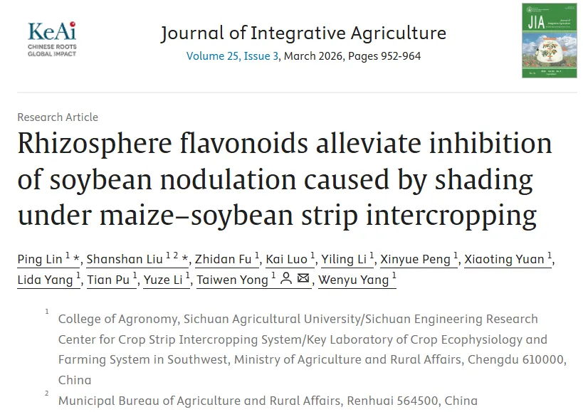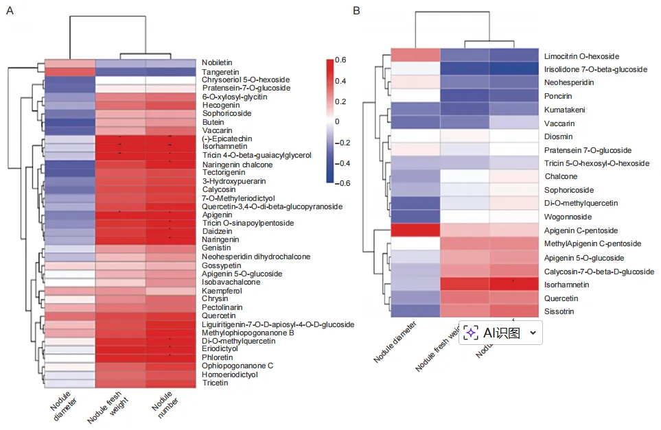 大豆根系分泌的三嗪酮 4'-O-β- 愈创木基甘油等 7 种化合物与结瘤数呈显著正相关;表儿茶素、异鼠李素与结瘤数显著正相关,异鼠李素还与结瘤鲜重显著正相关;诺必擂亭、橘皮素等与结瘤直径呈正相关。图6 根际黄酮类化合物与大豆根瘤表型的相关性分析