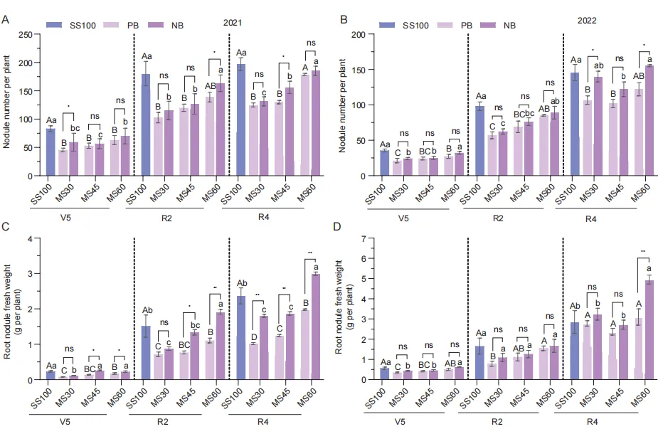 连续两年数据显示,间作大豆的单株结瘤数少于单作大豆,但无屏障处理(NB)显著促进了结瘤形成与发育:与屏障处理(PB)相比,NB 处理下 MS30(30 cm 行距)在五叶期(V5)和鼓粒期(R4)的单株结瘤数平均分别增加 24.4% 和 21.0%,MS60(60 cm 行距)在盛花期(R2)和 R4 期分别增加 12.7% 和 13.2%;V5 期 MS45、MS60 的 NB 处理结瘤鲜重较 PB 分别增加 31.4% 和 32.7%,R2 期 MS30、MS45、MS60 的 NB 处理结瘤鲜重较 PB 分别增加 28.6%、38.0% 和 23.6%。图1 2021年与2022年采用不同行距及根系分离处理的大豆植株结瘤数及结瘤鲜重