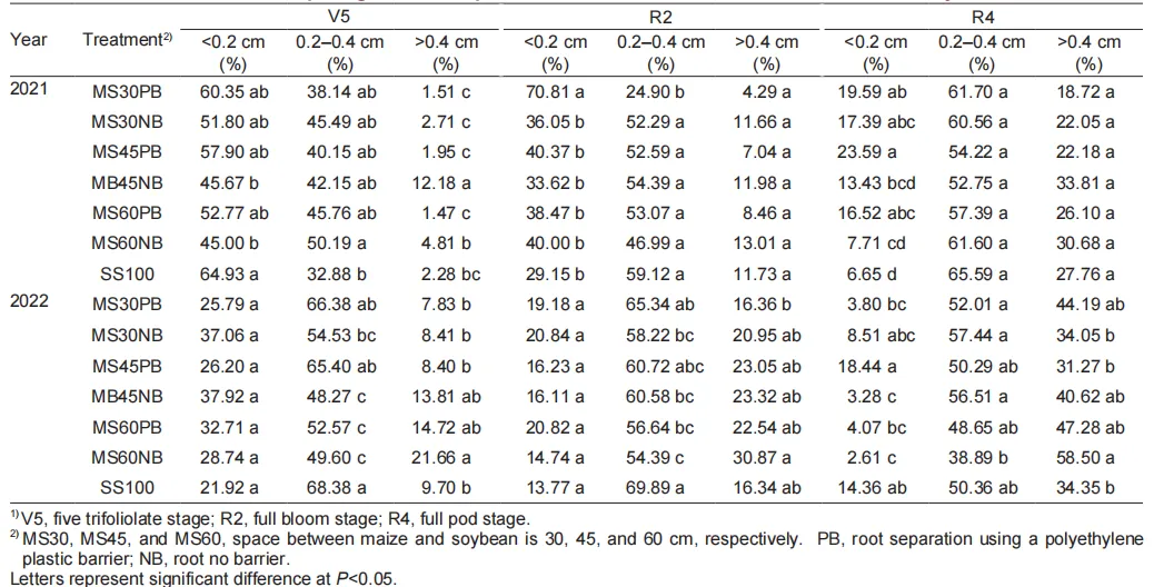 表1 不同行距和根系分离对大豆根瘤直径分布的影响