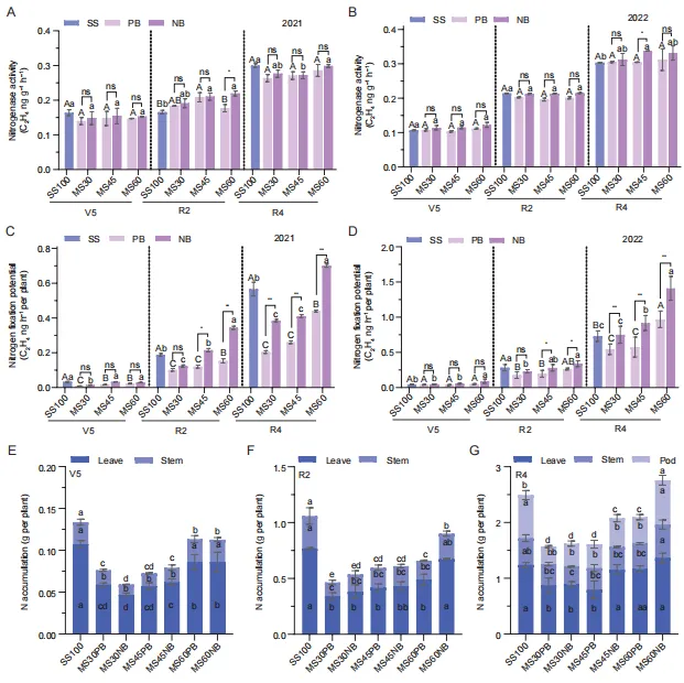 间作行距扩大对结瘤固氮酶活性无显著影响,但 NB 处理在 R2 和 R4 期的固氮酶活性显著高于 PB 处理。从 V5 到 R4 期,NB 处理的单株固氮潜力显著高于 PB 处理,且随间作行距扩大呈上升趋势。间作行距扩大对结瘤固氮酶活性无显著影响,但 NB 处理在 R2 和 R4 期的固氮酶活性显著高于 PB 处理。从 V5 到 R4 期,NB 处理的单株固氮潜力显著高于 PB 处理,且随间作行距扩大呈上升趋势。图2 不同行距和根系分离处理对大豆根瘤固氮能力和氮素积累的影响