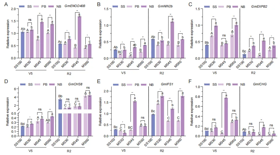 2022 年基因表达检测显示,根系互作更有利于结瘤及黄酮类合成相关基因表达:与 PB 相比,NB 处理下 MS45 的 GmENOD40B 在 V5 期表达上调 0.95 倍,R2 期上调 2.99 倍;GmNIN2b 在 MS45 的 V5 期上调 3.35 倍,R2 期 MS30、MS45、MS60 分别上调 0.34、1.69、0.43 倍;V5 期 MS30 和 MS60 的 NB 处理中 GmEXPB2 转录本丰度最高。黄酮类合成关键基因 GmCHS8 在 MS60 的表达高于单作;R2 期 NB 处理的 GmIFS1 表达高于单作,且 MS30、MS45、MS60 的 NB 处理较 PB 分别上调 0.24、0.81、1.62 倍;V5 期 NB 处理的 GmICHG 表达高于单作,但 R2 期除 MS45 的 NB 处理外均下降,MS45 的 NB 处理在 V5 期 GmICHG 上调 13.20 倍。图3 大豆在不同行距和根系分离条件下基因的相对表达量