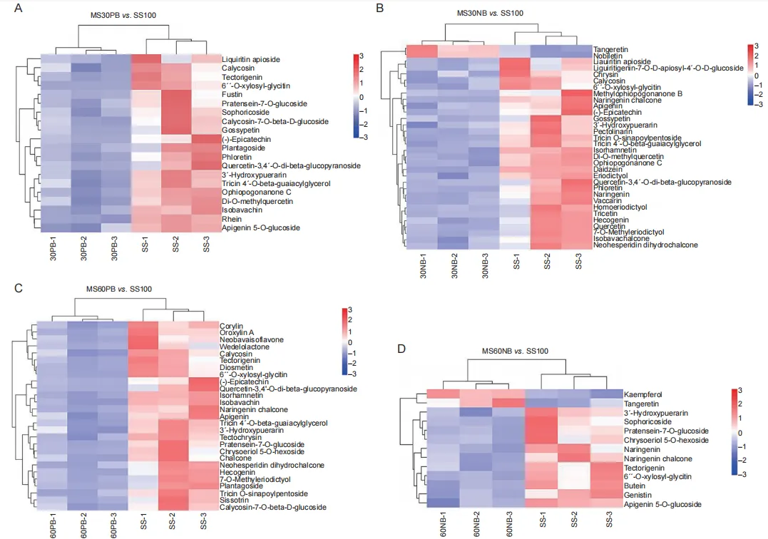 4.间作提升黄酮类 / 黄酮醇分泌,屏障处理降低差异代谢物丰度UPLC-MS 分析显示,以 VIP>1 且 P<0.05 为阈值,SS 与 MS30PB 组鉴定出 20 种差异代谢物(均下调),SS 与 MS30NB 组鉴定出 32 种差异代谢物(2 种上调、30 种下调,其中大豆苷元下降 2.35 倍);SS 与 MS60NB 组鉴定出 13 种差异代谢物(2 种上调、11 种下调),SS 与 MS60PB 组鉴定出 27 种差异代谢物(均下调),这些化合物主要包括黄酮类、黄酮醇、异黄酮、黄烷酮和查尔酮。UPLC-MS 分析显示,以 VIP>1 且 P<0.05 为阈值,SS 与 MS30PB 组鉴定出 20 种差异代谢物(均下调),SS 与 MS30NB 组鉴定出 32 种差异代谢物(2 种上调、30 种下调,其中大豆苷元下降 2.35 倍);SS 与 MS60NB 组鉴定出 13 种差异代谢物(2 种上调、11 种下调),SS 与 MS60PB 组鉴定出 27 种差异代谢物(均下调),这些化合物主要包括黄酮类、黄酮醇、异黄酮、黄烷酮和查尔酮。图4 玉米-大豆条带间作下大豆根系分泌物中黄酮类化合物的差异代谢物