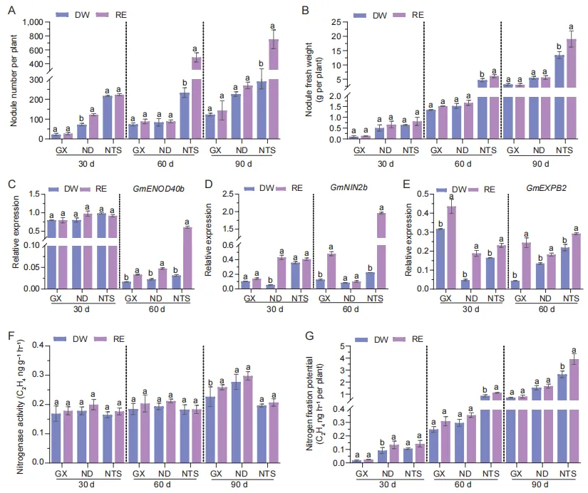 玉米根系分泌物(RE)处理可增加不同大豆基因型的结瘤数和鲜重:超结瘤型 NTS 在 60 天和 90 天的结瘤数分别显著增加 23.93% 和 29.9%,结瘤鲜重分别增加 53.05% 和 41.8%。玉米根系分泌物(RE)处理可增加不同大豆基因型的结瘤数和鲜重:超结瘤型 NTS 在 60 天和 90 天的结瘤数分别显著增加 23.93% 和 29.9%,结瘤鲜重分别增加 53.05% 和 41.8%。玉米根系分泌物(RE)处理可增加不同大豆基因型的结瘤数和鲜重:超结瘤型 NTS 在 60 天和 90 天的结瘤数分别显著增加 23.93% 和 29.9%,结瘤鲜重分别增加 53.05% 和 41.8%。图5 玉米根系分泌物灌溉后的根瘤表型、基因表达及固氮作用