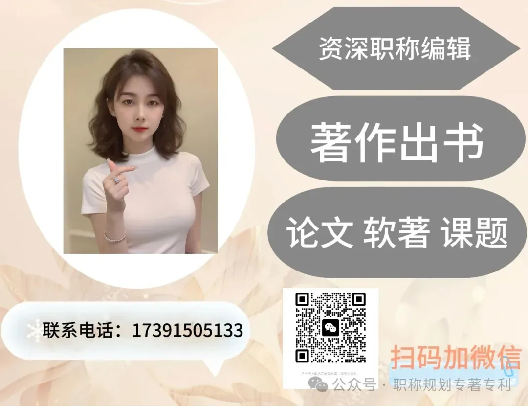 中级、副高、正高职称资料可进行辅助安排。资深顾问会依据当地要求为您量身定制方案,提供一对一指导,涵盖专利申请、专著出书、论文发表、课题研究、软件著作权等方面。扫描下方二维码与我联系!
