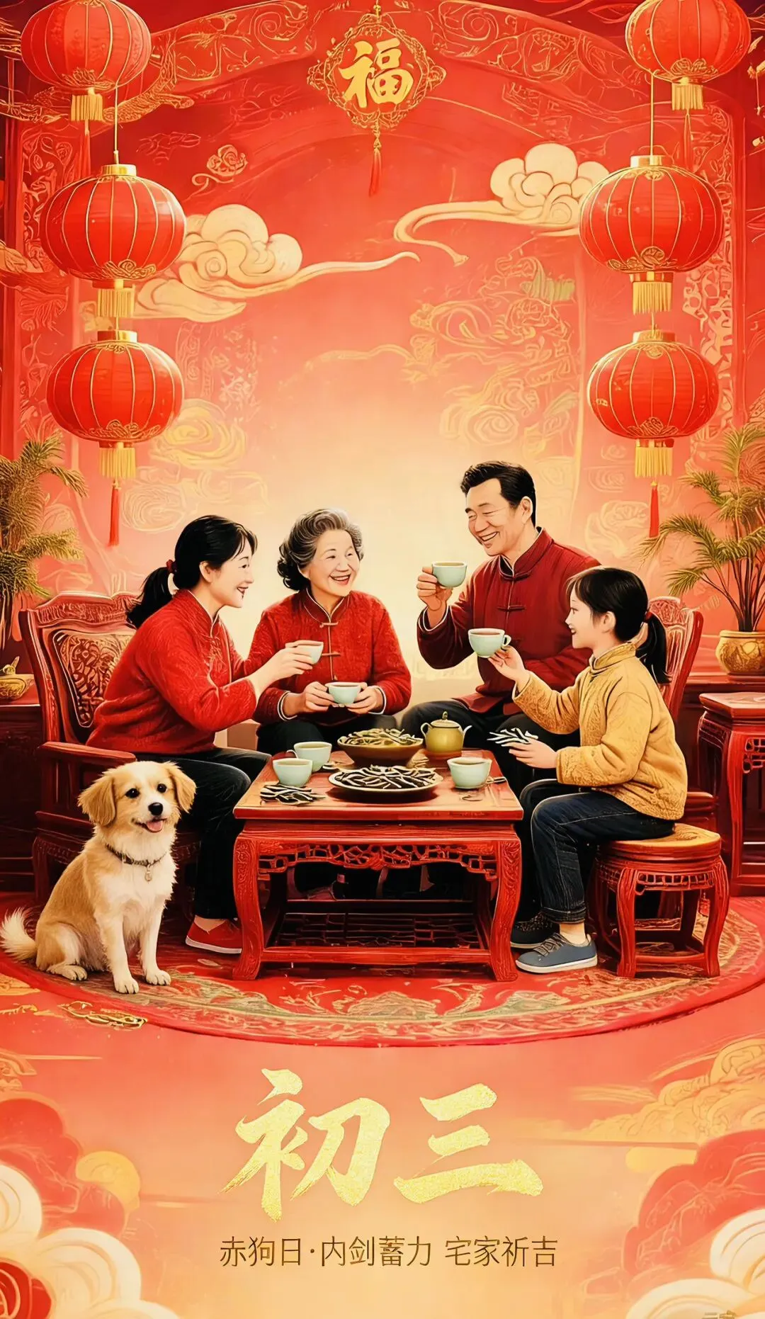 初三“赤狗日”源于民俗传说,赤狗是熛怒之神(对应火星),旧俗认为此日外出易冲撞赤狗招灾祸,所以忌远行;宅家是为避凶祈福,像画面里家人围坐喝茶闲叙,在团圆中守宅纳祥~