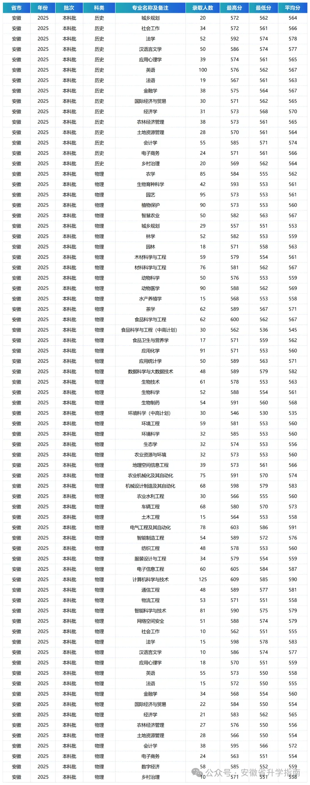 安徽农业大学坐落于科教名城合肥,是一所办学历史悠久、以农林生命学科为优势和特色、多学科协调发展的省属重点大学。作为安徽省高等农业教育的发源地,学校最耀眼的亮点在于其深厚的“大别山道路”办学传统——三十余年来坚持将论文写在大地上,把科技成果转化为服务乡村振兴的磅礴动能,形成了产学研紧密结合的鲜明特色,被誉为安徽农业现代化的“人才摇篮”与“创新引擎”。学校学科实力雄厚,多个涉农学科进入ESI全球排名前1%,在智慧农业、绿色食品、生物育种、生态环保等领域拥有国家级科研平台和一流师资,为学子成长提供坚实支撑。引用的数据是2025年高考它在安徽省的录取最低分与最低排位,以供广大考生和家长参考。