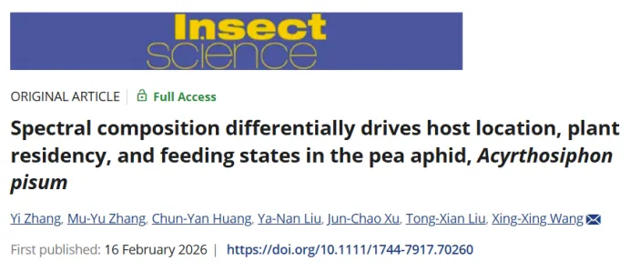 青岛农业大学植物医学学院王杏杏科研团队在TOP期刊发表科研成果:光谱组成对豌豆蚜的寄主定位、植株滞留及取食行为存在差异化调控