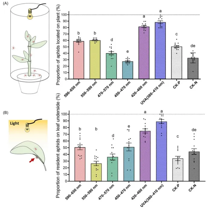 光信号是昆虫导航和取食的重要依据,蚜虫视觉系统对光谱的响应直接影响其寄主定位和迁飞扩散,黄板诱杀也已成为蚜虫监测和防控的常用手段。现有研究多聚焦有翅蚜远距离寄主定位的视觉响应,而无翅蚜短距离微生境选择中光谱信号的作用、触发寄主定位的光谱是否同样维持其取食,以及相关生理调控机制仍不清楚。为此,本研究以无翅豌豆蚜为对象,探究窄波段光对其寄主定位、植株滞留和取食的差异化影响,并解析单胺类神经递质合成基因的表达变化。