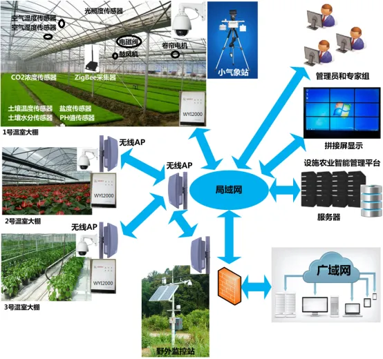建设可容纳60 人以上的实训空间,划分理论教学、工程技术、无土栽培三大区域,搭建农业物联网、智能控制等五大专业实验室;配套智能实训沙盘与虚拟仿真实训系统,模拟真实生产场景,承担物联网、农业大数据、AI 农业应用等课程教学,培养技能型人才。