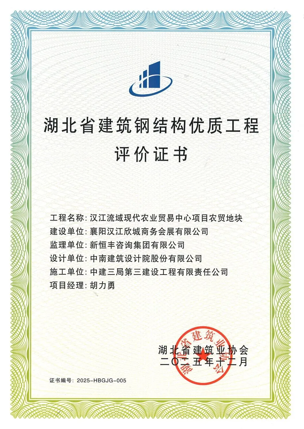 新年伊始,万象更新。建筑设计事业部参与设计的江流域现代农业贸易中心项目农贸地块荣膺2025年湖北省钢结构优质工程。这不仅为事业部新一年征程赢得亮眼“开门红”,更是主动融入国省大局、深耕设计创优的阶段性成果缩影。生动体现了事业部坚持“战略引领、创新驱动、品质为本”的显著成效,有力印证了精品工程是擦亮设计品牌、赋能高质量发展的核心引擎。