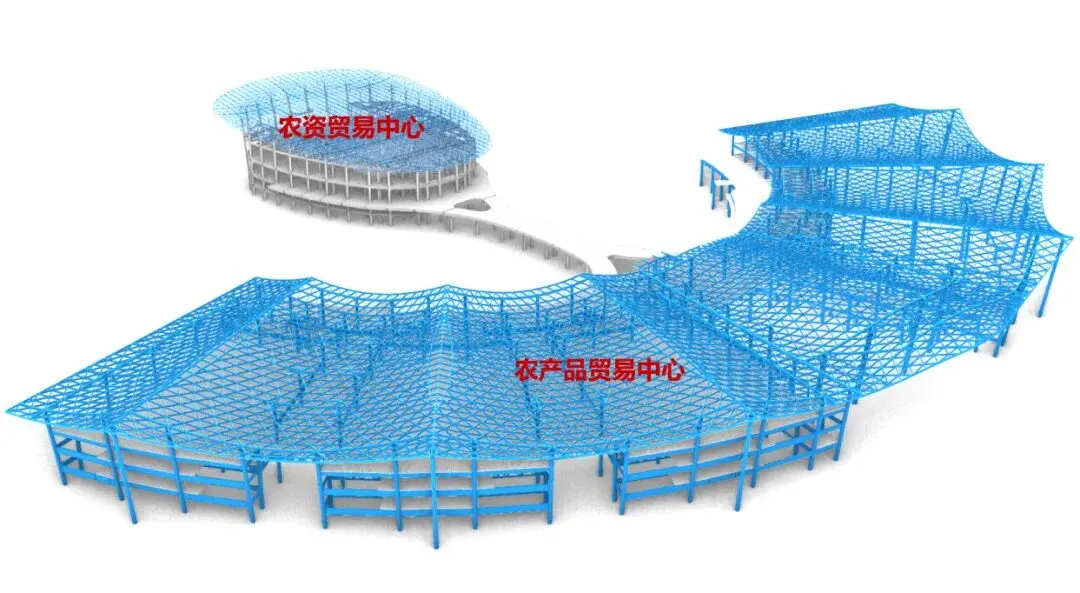 农产品贸易中心采用波浪形屋盖,整体呈扇形内弧长308m、外弧长544m,最大跨度88米,最大悬挑31.6米。为适应温度变化,在中部登录厅两侧设置两条变形缝,展厅最大跨度约50m,登录厅最大跨度约88m。