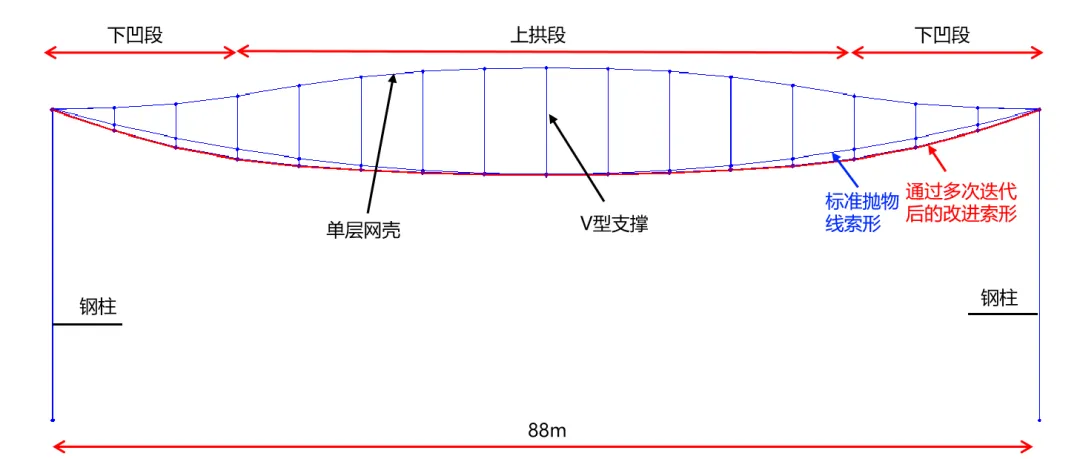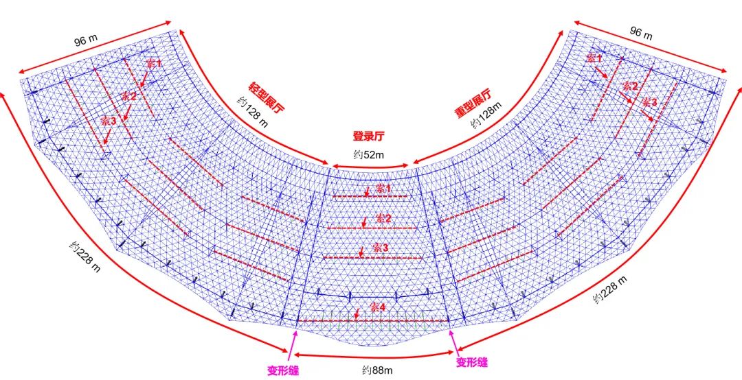以登陆厅为例,屋面采用独特的三段式双曲抛物面造型,中部隆起,两端微垂,形成了富有张力的视觉形态。登录厅入口处跨度约88m,悬挑距离35m,若拉索仍沿用传统的抛物线形,即使增大索力或失高,网壳两端下垂区域的变形与内力仍难以得到有效控制。