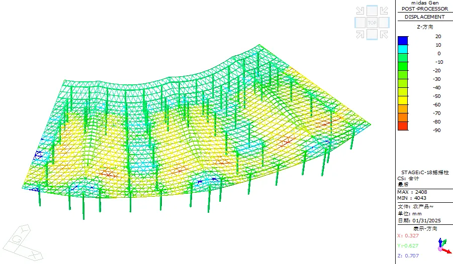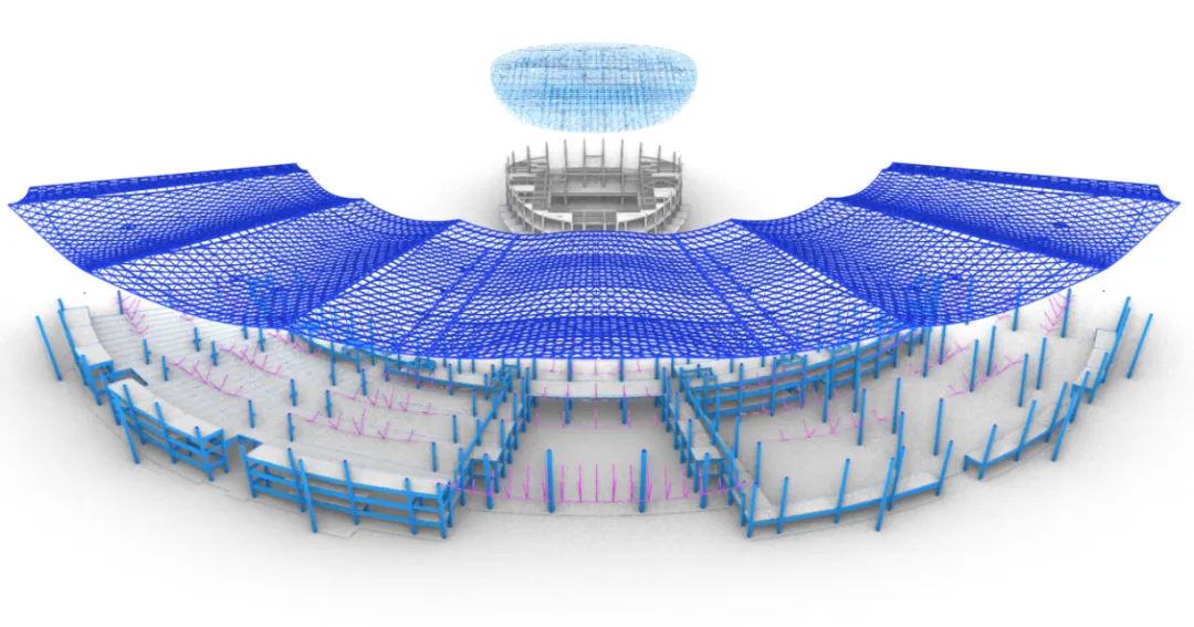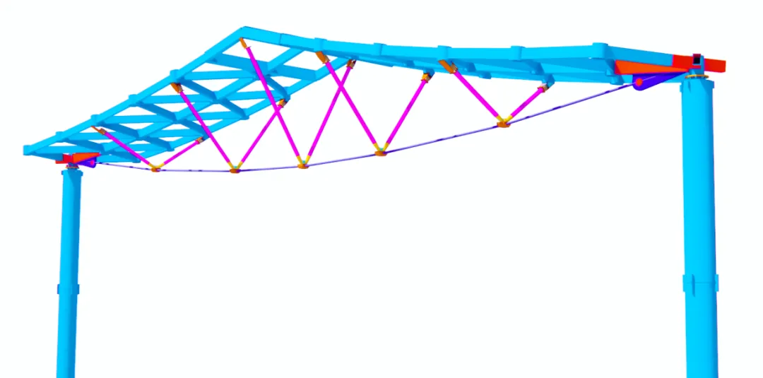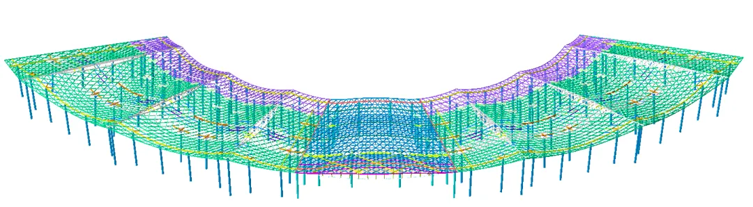 这一创新成果(已申请发明专利)在未增加用钢量与施工难度的前提下,大幅降低了屋盖两端关键区域的挠度与弯矩,使结构内力分布更为均匀合理。这不仅提升了整体结构的力学性能与安全储备,也实现了材料效能的最大化,体现了轻盈、高效、经济的现代钢结构设计理念,实现了力学与美学的统一。