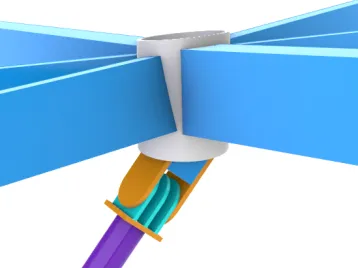 项目不设吊顶,结构外露,屋盖采用弦支单层网壳。单层网壳采用三向交叉网格,矩形钢管构件通过鼓形节点连接,高钒密闭拉索通过V型支撑与单层网壳连接,完美满足了大跨度结构对受力与变形的严苛要求。该体系充分发挥了钢索的抗拉与网壳的抗压优势,以高效、经济的方式,成就了力与美交融的室内空间体验。