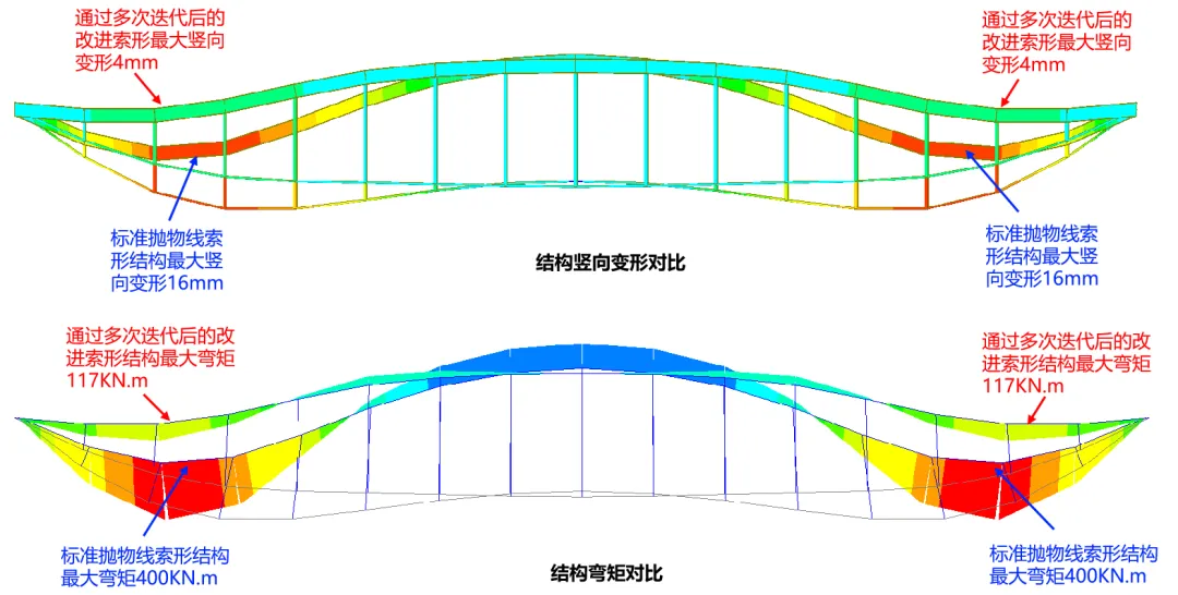 团队突破常规,提出了一项核心创新:基于结构变形反馈的“索形自适应找形”技术。不再固定索的初始形状,而是将网壳结构在荷载作用下的变形数据,动态地反馈并叠加到拉索的节点坐标上,通过多次自动迭代计算,智能地寻找到一种与结构变形高度协同的新索形。