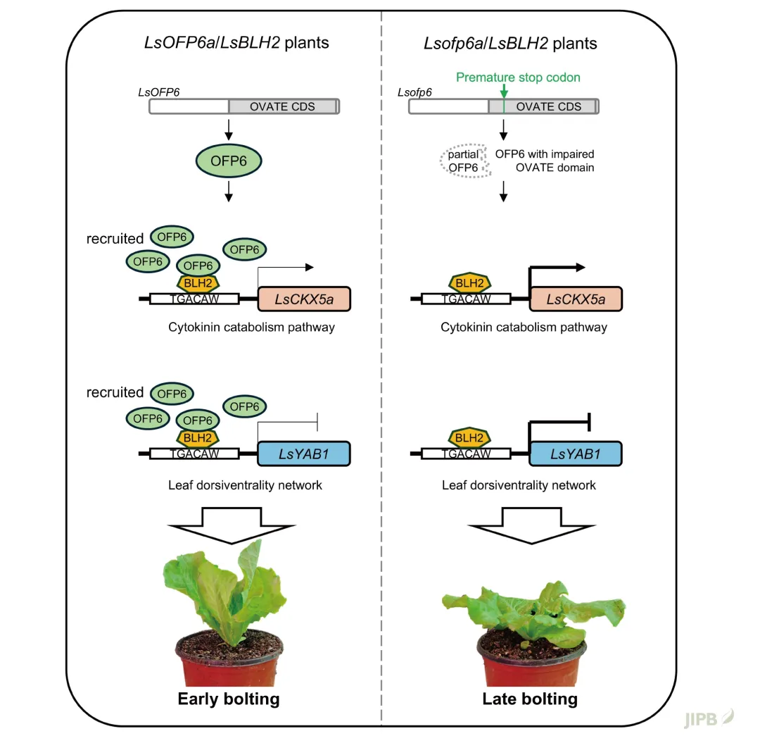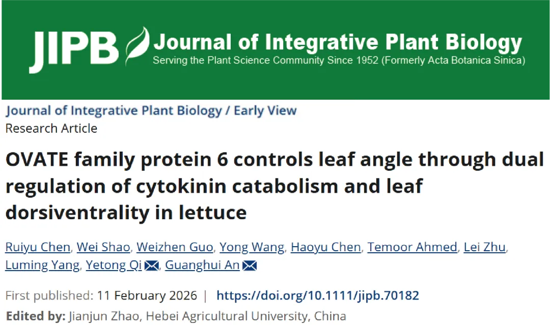 近日, 河南农业大学安光辉教授团队, 在JIPB发表题为“OVATE family protein 6 controls leaf angle through dual regulation of cytokinin catabolism and leaf dorsiventrality in lettuce”的研究论文 (https://doi.org/10.1111/jipb.70182), 首次揭示了OVATE家族蛋白LsOFP6a通过细胞分裂素代谢与叶背腹性精准调控生菜叶夹角的分子机理, 为培育高密度适配型生菜品种提供了全新遗传靶点。