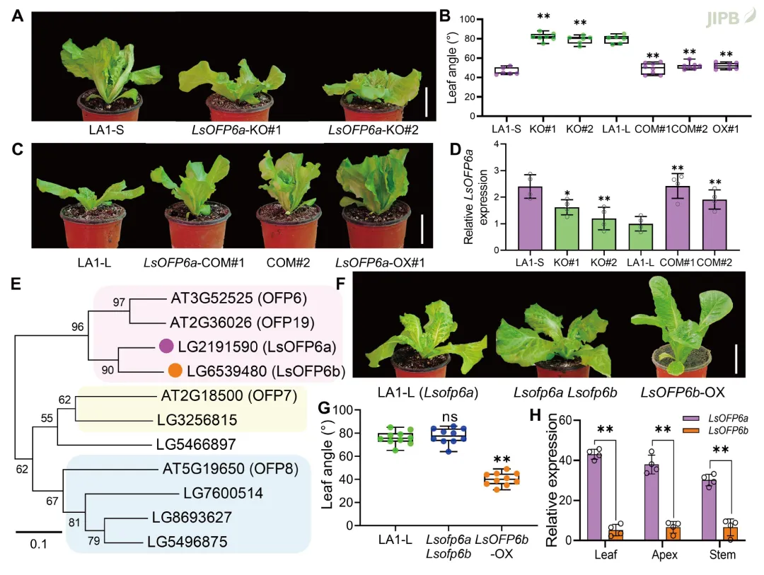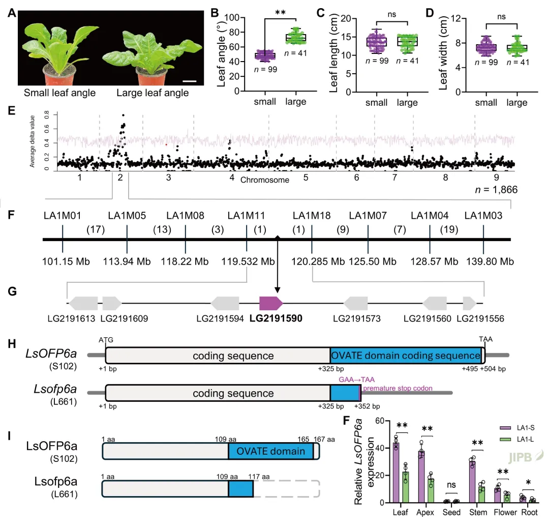 本研究通过BSR-seq技术图位克隆了2号染色体的叶夹角调控基因LsOFP6a。序列分析发现, 大叶角植株的LsOFP6a基因存在无义突变, 导致蛋白质翻译提前终止, OVATE结构域受损。LsOFP6a基因主要在叶片、茎尖和茎中表达, 且在小叶夹角植株中表达量更高 (图1)。