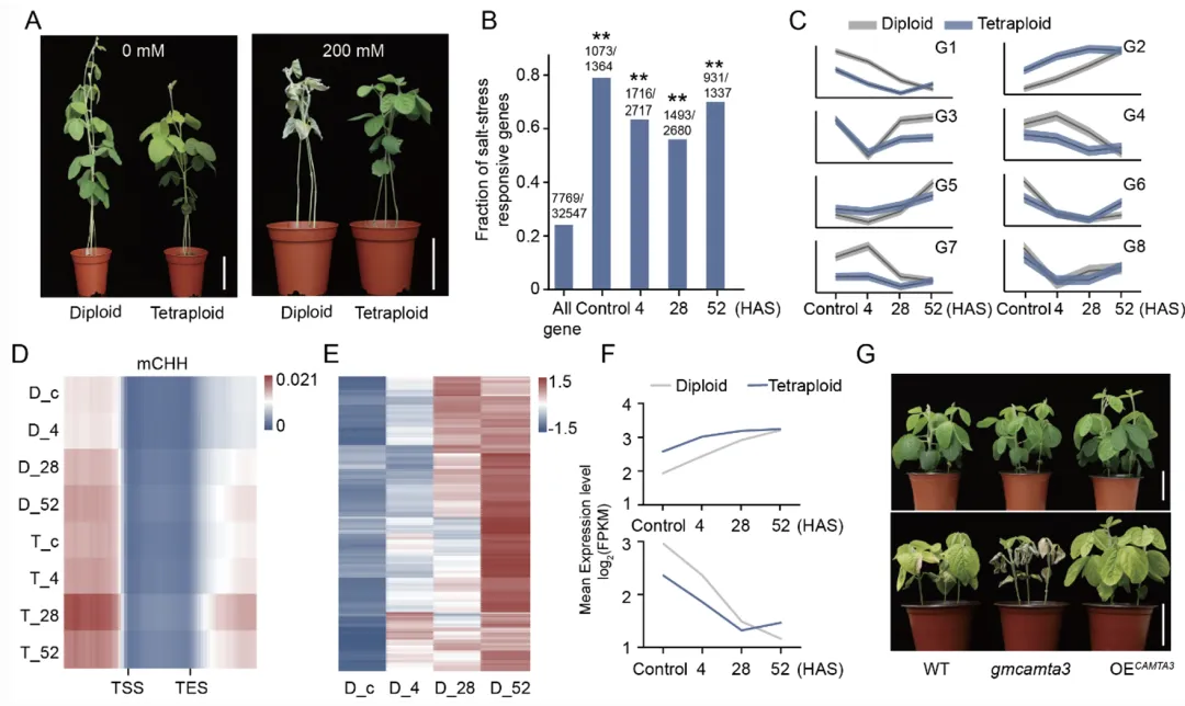 A:二倍体和四倍体大豆在盐胁迫下的表型。B和C:二倍体和四倍体大豆盐胁迫响应基因的表达模式。D:基因及侧翼区域的CHH甲基化水平。E:二倍体大豆在盐胁迫不同时间点hyper-DMRs的甲基化水平。F:多倍化诱导的hyper-DMRs相关基因的时空表达动态。G:野生型、GmCAMTA3基因突变体和过表达株系在盐胁迫下的表型。