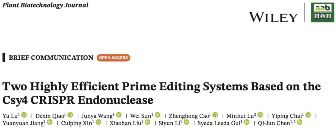 中国农业大学生物学院植物抗逆高效全国重点实验室的陈其军教授团队在植物生物技术权威期刊 Plant Biotechnology Journal 发表了题为“Two Highly Efficient Prime Editing Systems Based on the Csy4 CRISPR Endonuclease”的研究论文。该研究创新性地开发了基于Csy4核酸内切酶的新型引导编辑系统。