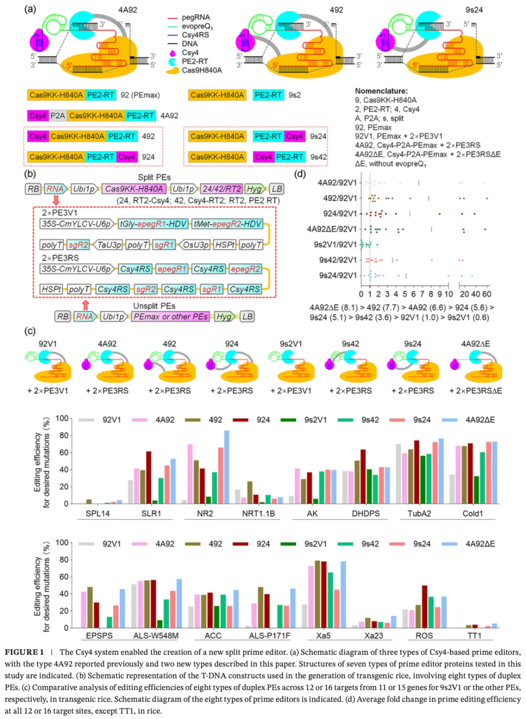 - 首创Csy4拆分PE:利用Csy4与RNA产物的高亲和力,开发了新型拆分PE(SpCas9KK-H840A + Csy4-RT)。该系统将pegRNA加工、保护和RT招募耦合在一起,极大简化了反应步骤,在水稻中实现了比传统拆分PE更高的效率。