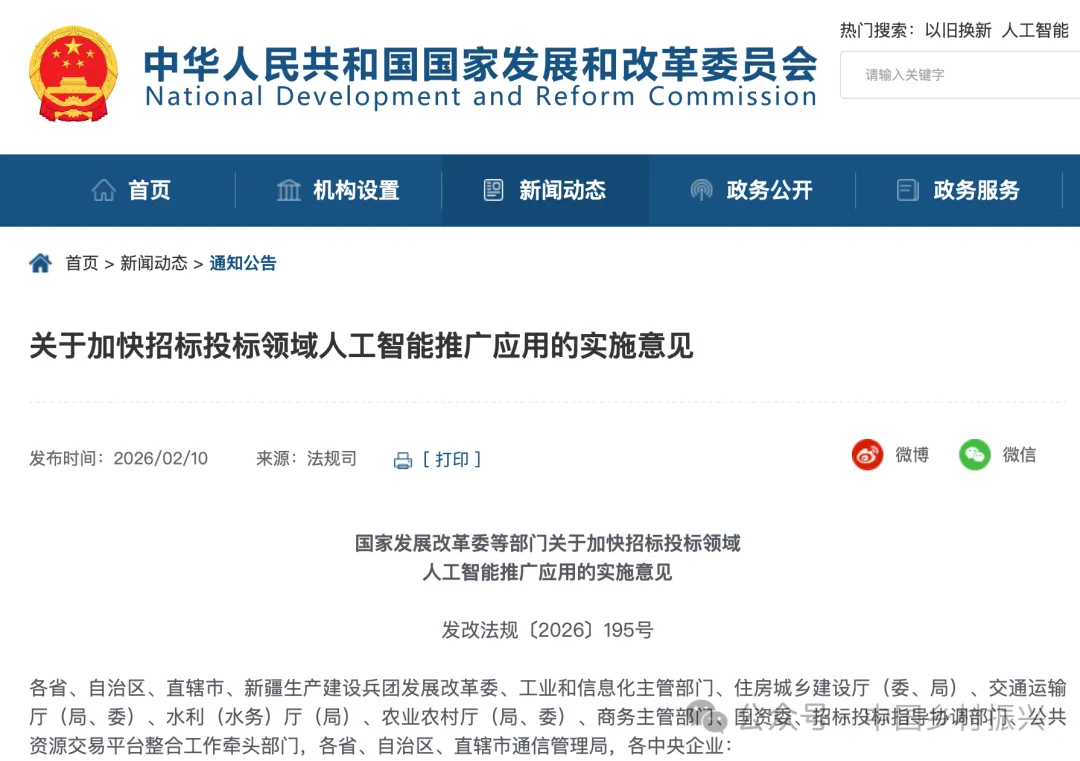 各省、自治区、直辖市、新疆生产建设兵团发展改革委、工业和信息化主管部门、住房城乡建设厅(委、局)、交通运输厅(局、委)、水利(水务)厅(局)、农业农村厅(局、委)、商务主管部门、国资委、招标投标指导协调部门、公共资源交易平台整合工作牵头部门,各省、自治区、直辖市通信管理局,各中央企业:为贯彻落实党中央、国务院关于深化招标投标改革部署要求,按照《国务院关于深入实施“人工智能+”行动的意见》有关安排,推动招标投标和人工智能深度融合、促进招标投标市场规范健康发展,现提出如下意见。围绕招标投标交易全过程和管理重点环节,按照政府引导、多方参与、场景牵引、安全可控的原则,积极稳妥推进人工智能在招标投标领域的应用,改进招标投标范式,提升服务和监管的数智化水平,为保障公共资源公平高效配置、规范招标投标市场秩序提供有力支撑。2026年底,招标文件检测、智能辅助评标、围串标识别等重点场景在部分省市实现全覆盖应用;2027年底,更多重点场景在全国范围内推广应用,形成一批模型训练、场景应用、机制保障等方面的经验做法,有效促进招标投标市场规范健康发展。1.招标策划。辅助招标人对行业趋势、市场供需、资源要素等进行综合研判,准确理解、分析有关项目的投资审批、招标投标、履约验收等信息,生成客观量化的招标需求、技术和商务条件,从源头提高招标的科学合理性。2.招标文件编制。在深度理解项目目标、建设内容、招标需求、技术和商务条件等基础上,结合历史交易情况和政策法规要求,智能匹配招标文件范本,推荐适合的资格条件、评标办法和评标标准,辅助招标人编制或自动生成招标文件,提升招标文件的编制质量。3.招标文件检测。结合有关政策法规要求,对招标文件开展合规性、合理性、错敏词等多维度检测,自动识别各类违法违规和排斥限制竞争等问题,提示判断依据和修改建议,辅助招标人对招标文件进行智慧纠偏。鼓励实行招标文件“先体检、再发布”。4.投标策划。全方位捕捉各类项目招标信息,结合投标人特点推送适合的项目信息,自动提取并解析项目招标计划、招标公告和招标文件等资料中的关键要素,智能生成招标需求图谱,对重要内容进行提示。结合历史交易和同类项目等情况,辅助分析评估参与项目竞争的经济性,提高投标效率。5.投标合规自查。深度解析项目招标需求和招标文件要求,结合投标人的特点和优势,辅助投标人确定技术方案和报价区间。对投标人编制的投标文件,对照招标文件进行响应性比对,自动提示投标文件中的违法违规、错误缺漏等问题,辅助投标人针对性修改完善。对可能低于成本价的投标进行风险提示,减少恶意低价竞标等情况。6.开标。打造类人化的数字开标人,调度项目开标活动全流程,自动完成宣读开标纪律、公布投标人名单、标书解密、唱标、结果确认等工作。智能判断开标异常情况并进行提示,辅助招标人实时高效处理。7.专家抽取。综合解析项目特点和评标要点,根据评标专家的专业分类、地域分布、回避规则等条件,结合远程异地评标等要求,自动生成与项目相适应的专家抽取方案,提高所抽取专家与项目的匹配度,保障专家抽取的科学性和公正性。8.智能辅助评标。打造类人化的评审推理能力,掌握不同专业评标专家的知识结构体系,按照项目类型建立综合评审指标体系,结合具体项目推荐或匹配评审点,全面提取招标投标文件要素,深度解析招标文件内容和投标文件响应度,辅助专家开展评审或生成结果供专家参考,提升评标的公正性。9.评标报告核验。打造评标报告智能审核能力,辅助招标人核查评标报告的数据准确性、逻辑关联性、内容合规性等,自动预警客观评审因素评分不一致、分值计算错误、专家打分偏离度过大等问题,提示评标专家进行复核确认并修改完善。10.辅助定标决策。基于招标需求、供应链管理、历史交易情况等,结合有关行业、信用、税务、司法等平台系统数据,对中标候选人进行多维立体画像。引入数字人答辩等方式,辅助招标人对中标候选人进行综合比对分析并作出定标决策,实现定标全过程记录和可追溯。11.中标合同签订。在招标投标文件资料中自动提取中标合同的主要签约要素,参考有关示范文本并结合项目专用合同条款生成合同,实现合同的在线签订和存档。结合政策法规要求、历史交易情况等,对中标合同的关键权利义务条款进行风险提示,减少“阴阳合同”、随意篡改等问题。12.场所调度。对交易场所进行全方位智能化管理,高效调配场所工位资源和人员力量,动态监测交易场所中的各类人员和活动情况,提高交易设施的智能化水平,打造无人值守的智慧交易环境。加强交易场所之间的协同联动和资源互补,提升跨区域交易服务的便利化水平。13.见证管理。构建“智能研判—动态干预—链上存证”的闭环见证体系,对招标投标交易各环节进行无感化数字见证,全面、准确记录交易全过程。强化异常行为分析预警,对涉嫌违法违规活动及时提醒劝阻,加强问题线索报告,为有关部门执纪执法提供支撑。14.档案管理。构建招标投标交易档案智能化管理体系,结合智能见证管理实现交易文件的智能填报、交易数据的链上存证。对招标投标交易资料进行智能命名与归类,自动生成档案索引
