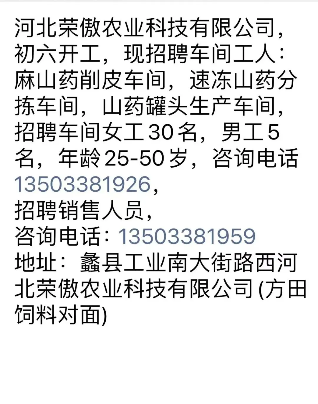 河北蠡县荣傲农业科技公司招工!