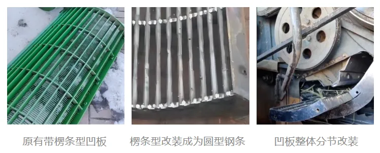 该技术针对克拉斯470收获机在收获过程中出现秸秆过脱,杂余大,破碎多等技术问题,为了减少籽粒杂余大,破碎多等技术问题,针对小麦通用型凹板进行改装,将N718带楞条型将棱形钢条改装成为圆型钢条;将在原有的棱形钢条的间距基础上增加3毫米;将整体通用型凹板改装成分节安装结构。通过此次改装解决了传统收获杂余大,清选不干净,打滑、破碎率高的问题。
