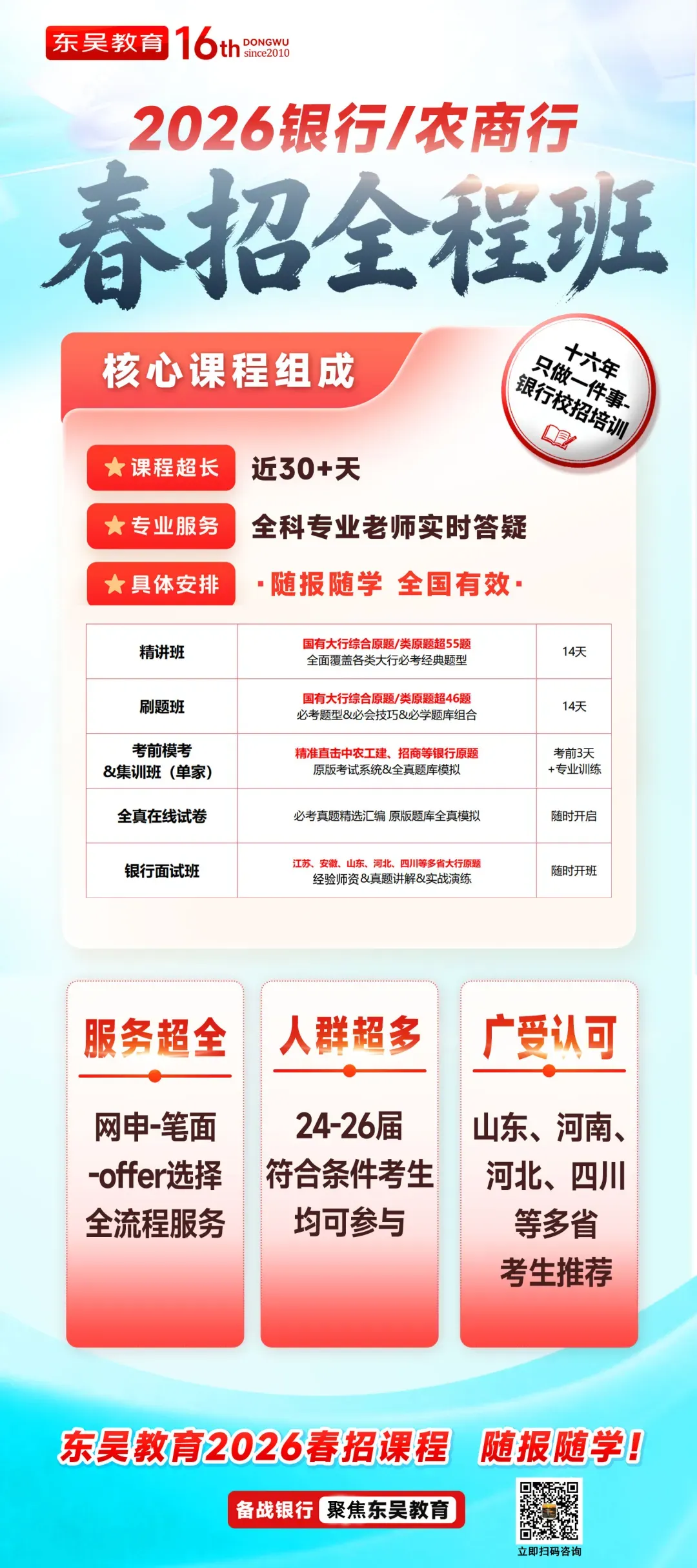 为帮助同学们系统性备考,抓住春招宝贵机会,东吴2026银行/农商行春招全程班,涵盖从网申指导到面试训练的全流程,旨在帮助同学们科学规划、稳步推进。